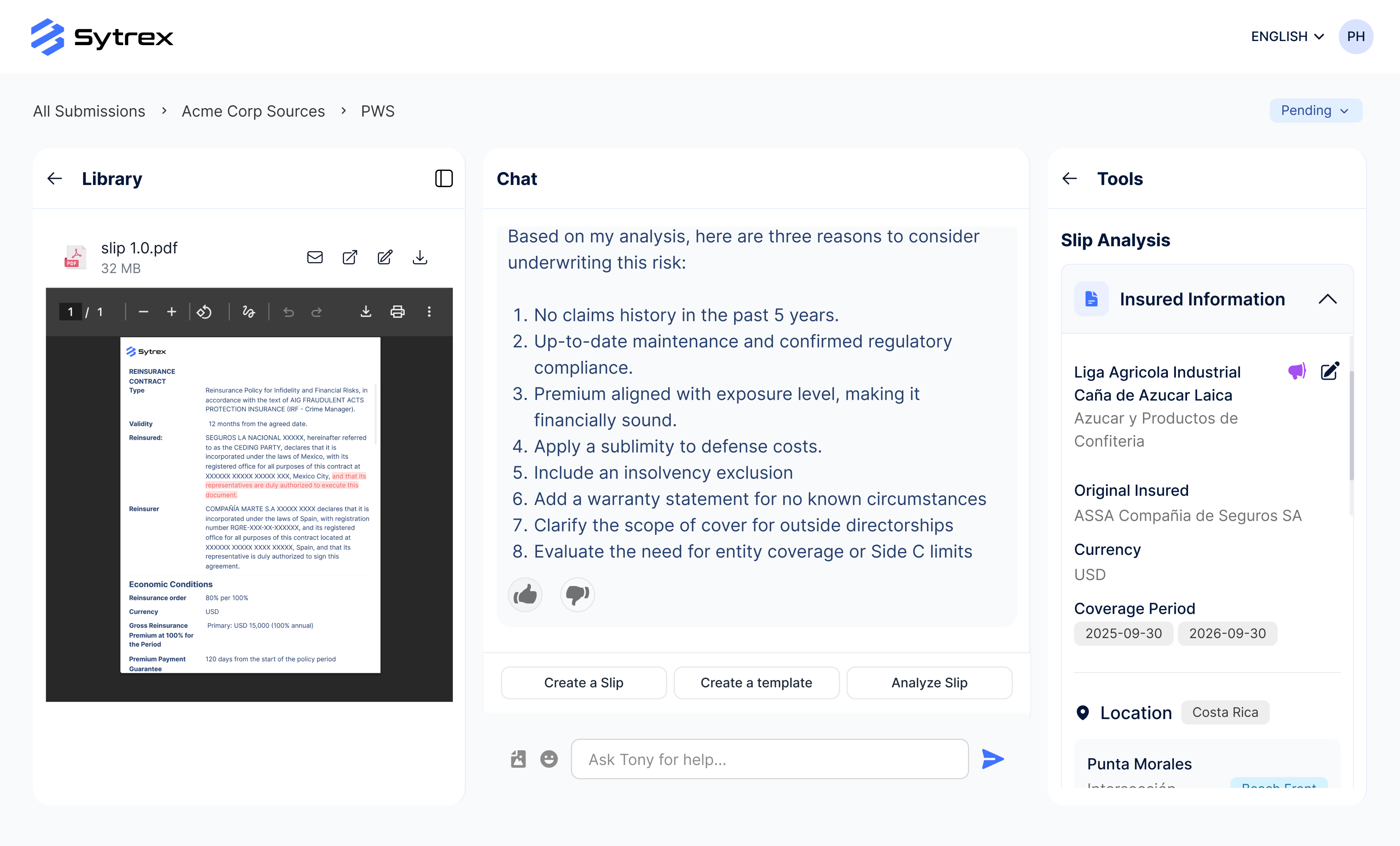 Don’t dig through endless Slips and Inspection reports, Tony extracts the key fields so Underwriters can make decisions faster and with confidence.